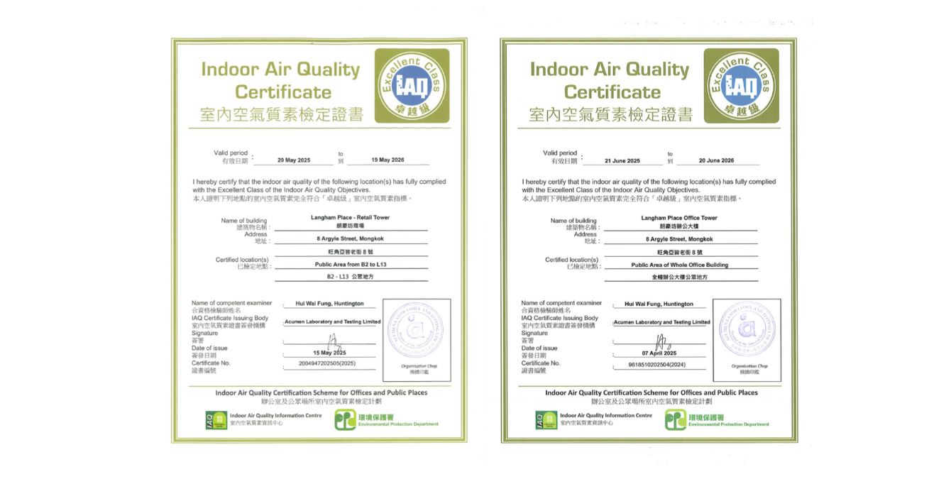 優質室內空氣質素再次獲環境保護署嘉許認可